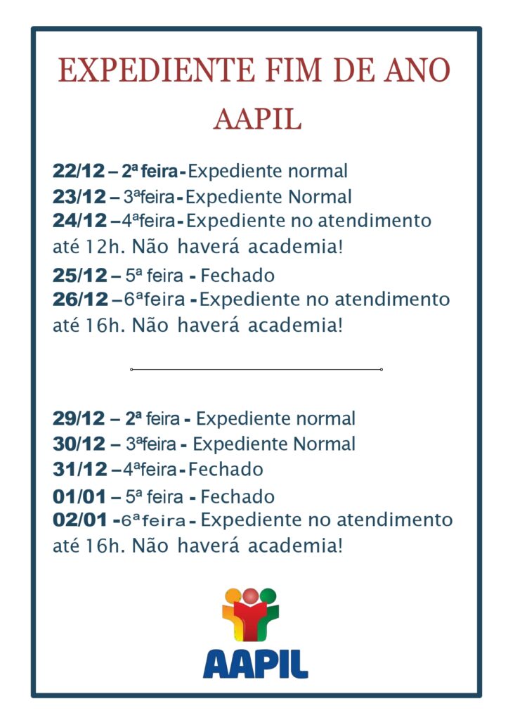 CONFIRA O EXPEDIENTE DA AAPIL NESTE FINAL DE ANO Talvez você goste também COMEMORAÇÃO AO DIA DO IDOSO 24 de setembro de 2025 Expediente AAPIL Final de Ano 20 de dezembro de 2024 Violência contra Mulher 25 de setembro de 2024